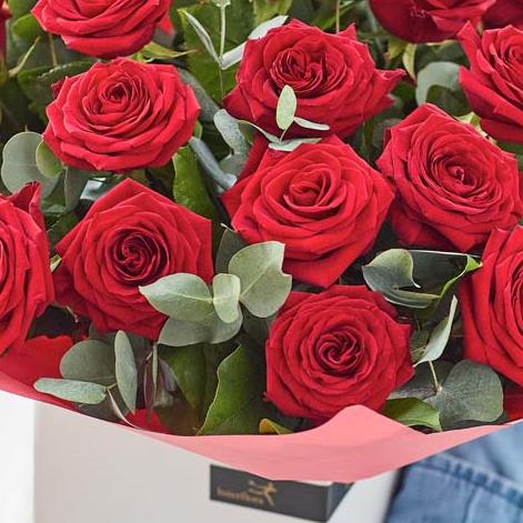Want to woo someone with flowers? This is how you do it. Our artisan florists spiral long-stemmed red roses in the hand to create this magnificent bunch. It's then beautifully gift-wrapped and hand-delivered for a truly magical doorstep moment.
