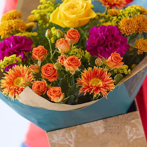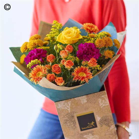 A classic handcrafted bouquet made by a local florist using the freshest blooms and not a single lily. Expect blooms in rich vibrant colours like cerise, fiery orange and sunshine yellow, expertly arranged and shown off in our iconic packaging.
