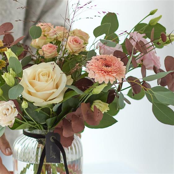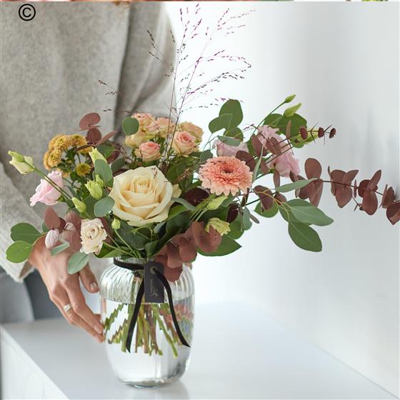 An exquisite array of blooms perfectly arranged in a vase handblown in Europe. It'll feature gorgeous blooms, foliage and dried flowers in muted colours like terracotta or silvery green.