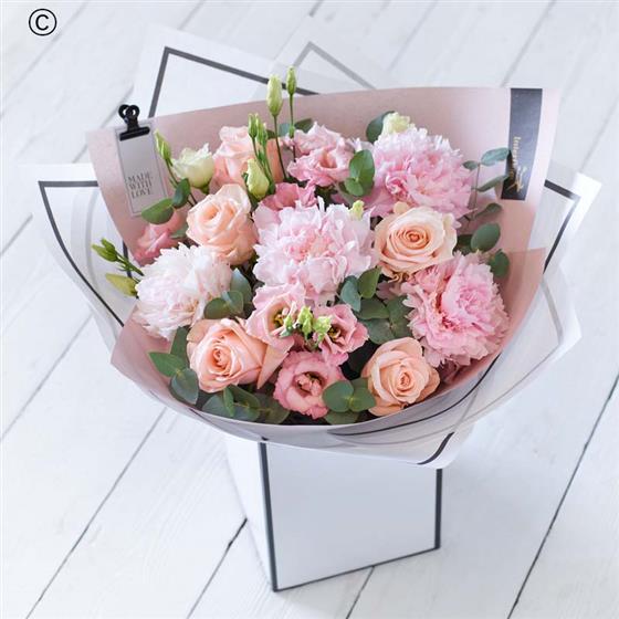 An exquisite bouquet that puts all the attention on the season's showstopper bloom: the peony. It'll feature at least four of these fluffy icons, each expertly picked by the florist for their beauty, then exquisitely arranged with two other co-ordinating types of bloom.