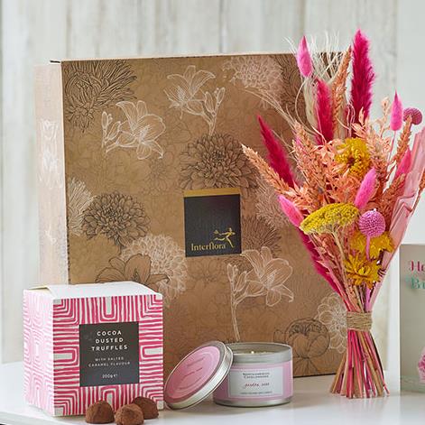 A proper birthday treat, this gorgeous gift box includes scrummy salted caramel flavour truffles, a Garden rose scented candle, and an extra cute cupcake card. It also comes with a selected of pretty pastel dried flowers, chosen by a florist.