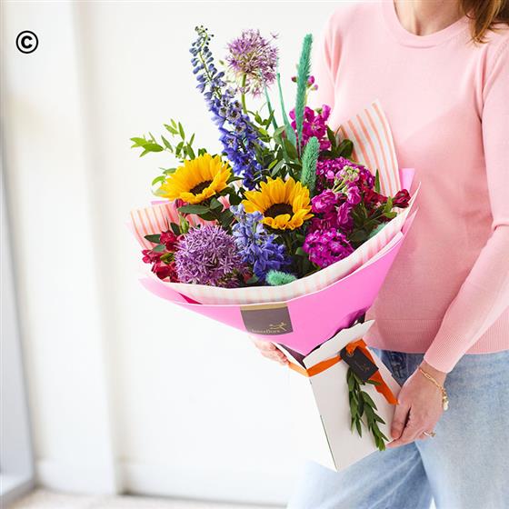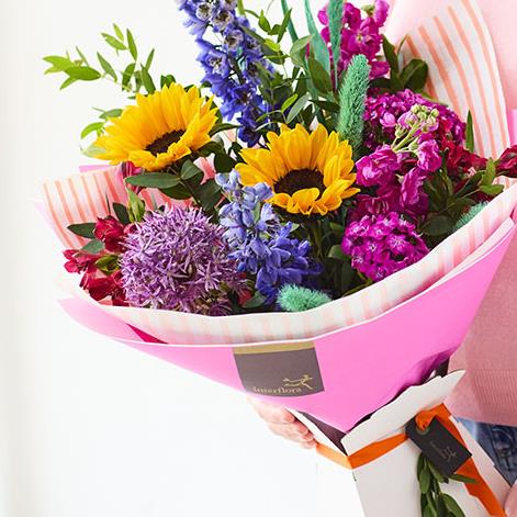 A bouquet that celebrates the beauty of British blooms and features flowers sourced from UK growers*. Full of vibrant hues, expect cerise, reds, fiery orange, pops of blue or yellow plus dried flowers or foliage for texture. Here’s to backing home grown!
