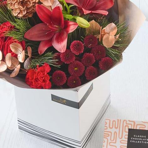 A beautiful handcrafted bouquet in festive colours, plus a delicious box of chocolates.