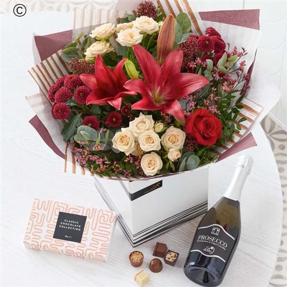 A gorgeous bouquet crafted by their local florist, using the finest blooms in rich red and green shades, with peach and cream highlights and pops of burgundy and cerise. And in case that wasn't enough to make them merry, this one comes with a bottle of fizz and chocolates too.