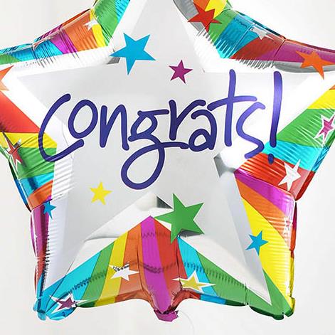 Add some colour to their celebrations with this star shaped helium balloon. This design features a burst of rainbow colours and a silver star with a ‘Congrats!’ motif in the centre. The 50cm micro-foil balloon arrives filled with helium and tied to a weight with a curling ribbon.