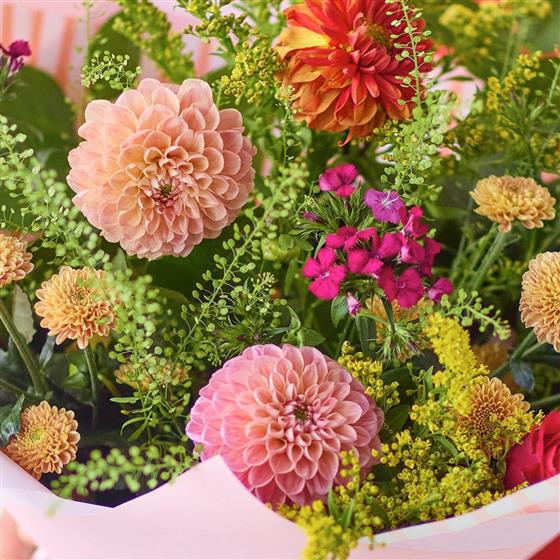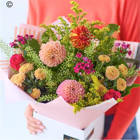 A beauty of a handmade bouquet with flowers in vivid colours plus at least three stunning dahlias.
