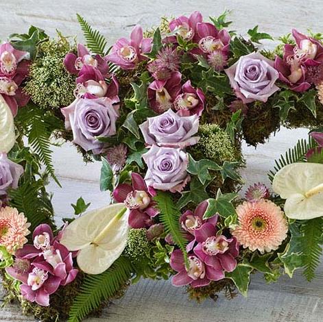Two beautiful hearts with an open design, each features the finest orchids, anthuriums, and delicate lilac roses nestled in fresh foliage.