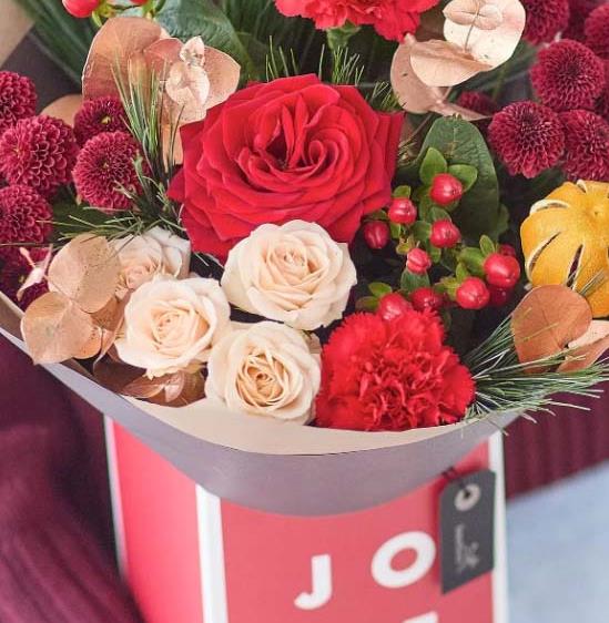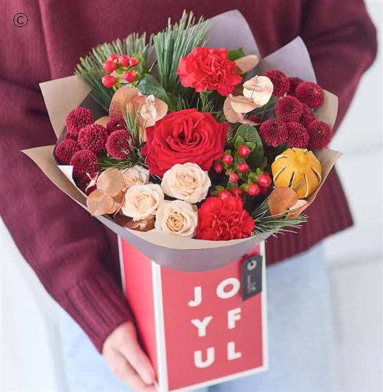 A lovely little gift box of fresh blooms in classic Christmassy colours, chosen and arranged by an expert local florist.