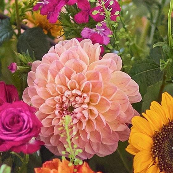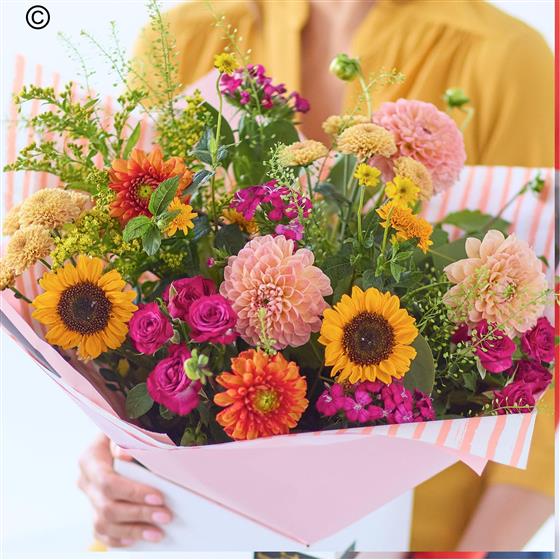 A beauty of a handmade bouquet with flowers in vivid colours plus at least three stunning dahlias.