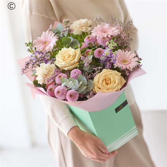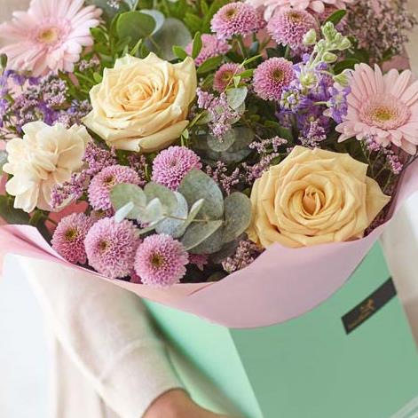 A large soft pastel arrangement presented in a gift box. Gentle tones and fresh flowers arranged with care, ready to deliver as a thoughtful, uplifting surprise.
