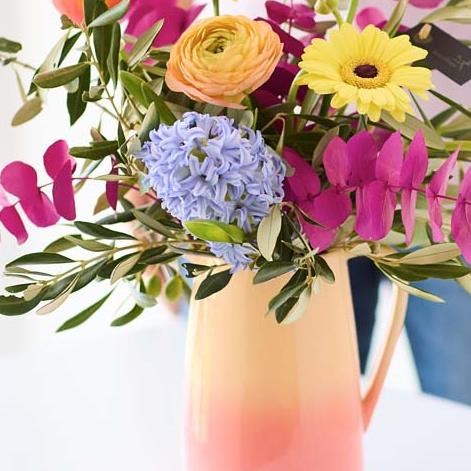 A gorgeous bouquet of fresh flowers handcrafted by a local florist, beautifully arranged in a lovely ombre effect ceramic jug, so mum doesn’t need to lift a finger. Plus she can keep using the jug long after the flowers have faded. Perfect. This year our Mother’s Day designs are all about gorgeous pastels with pops of colour. Expect to see blooms in shades of baby pink, cream, and lemon with bursts of cerise and tangerine, and highlights of pale blue and lilac.