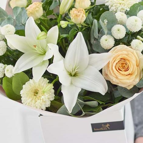 A soothing bouquet of gorgeous neutral flowers, expertly arranged by a skilled local florist. It’ll feature fresh foliage contrasted with cream or white flowers. Exactly which blooms will depend on what’s freshest and the occasion – every bouquet is beautifully unique, made bespoke.