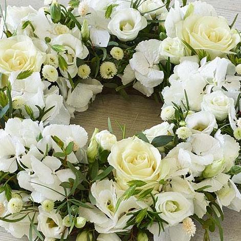 A profusion of white blooms, this elegant wreath features the finest hydrangeas, fragrant rosemary and dried lagarus 'bunny tails'.