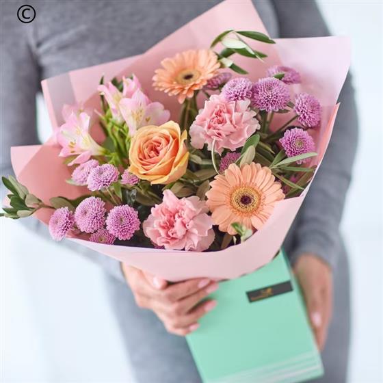 Delight someone special with this charming gift box, filled with a lovingly arranged, handmade bouquet of dreamy pastel flowers. Soft and romantic in style, the bouquet features fresh seasonal blooms and foliage in gentle shades such as lilac, cream, lemon, peach, and baby blue.
