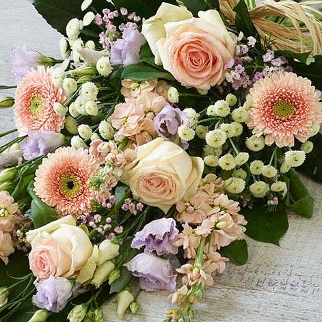 An abundance of blush pink blooms featuring fragrant peach stocks, pale pink roses and lilac lisianthus.
