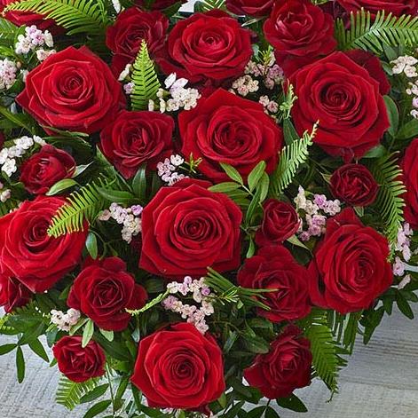 A vibrant heart tribute featuring gorgeous roses, spray roses and foliage.
