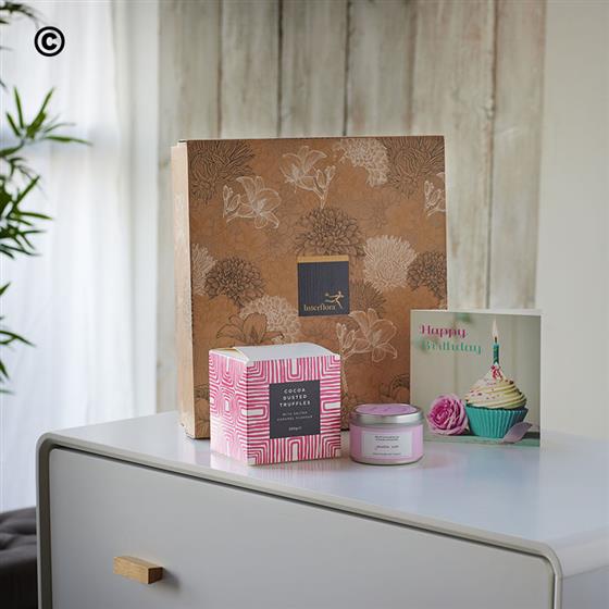 It's their birthday so treat them to something extra special. Salted caramel flavour chocolates, a beautiful Garden rose candle and a fun cupcake card should do the trick