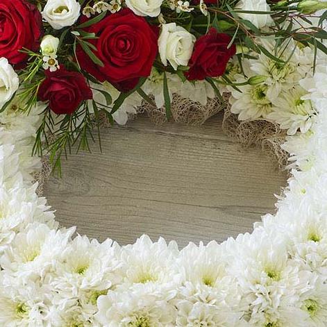 A traditional wreath of white chrysanthemums contrasted with a cluster of pretty roses, lisianthus and delicate foliage.