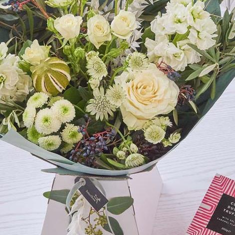 An exquisite handcrafted on trend bouquet, plus a delicious box of chocolates.