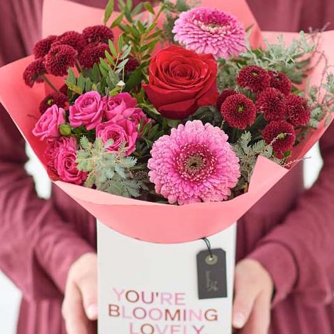 A gorgeous mix of romantic blooms, exquisitely arranged by an artisan florist and safely tucked in a beautiful giftbox. It'll feature blooms in classic Valentine's colours including cerise, burgundy and soft pink.